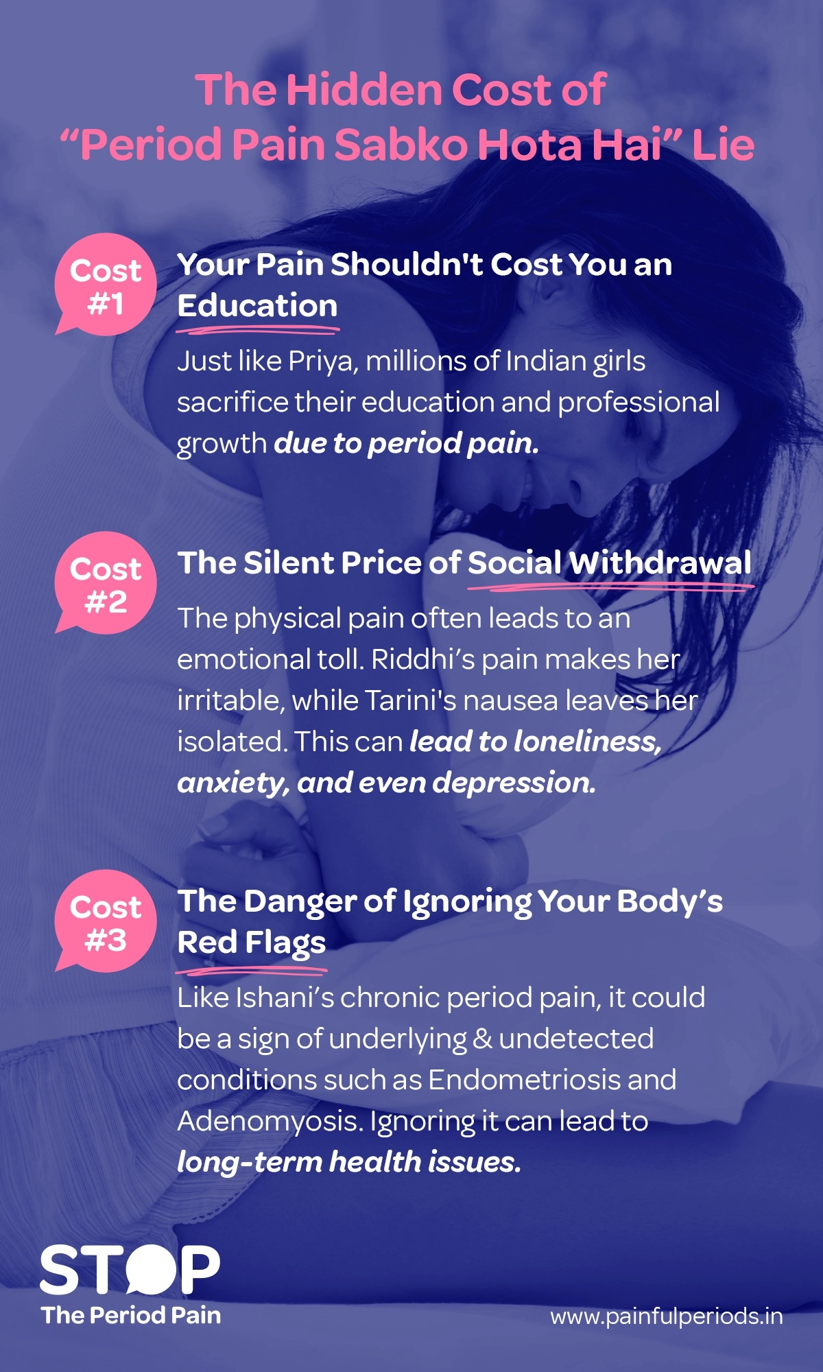 Every month, millions of Indian girls & women suffer in silence, told that their severe period pain (dysmenorrhea) is “normal.” Our mission is to break that silence. #StopThePeriodPain campaign is here to empower you with 3 simple truths: